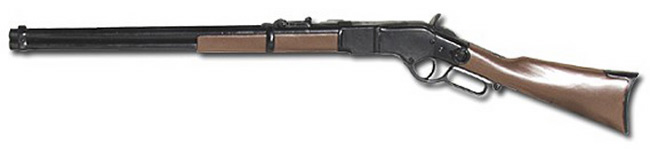 This is a nonfiring replica of the rifle that won the Wild West. The main body is made of hardwood. The barrel is blued. The cocking action works!