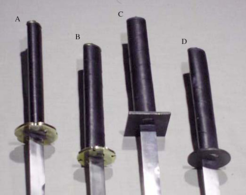 These are combat worthy katanas, manufactured by American Fencers Supply. Each has a different guard (called a "tsuba"), made of solid brass - some shiny and some blackened (see photo for which).